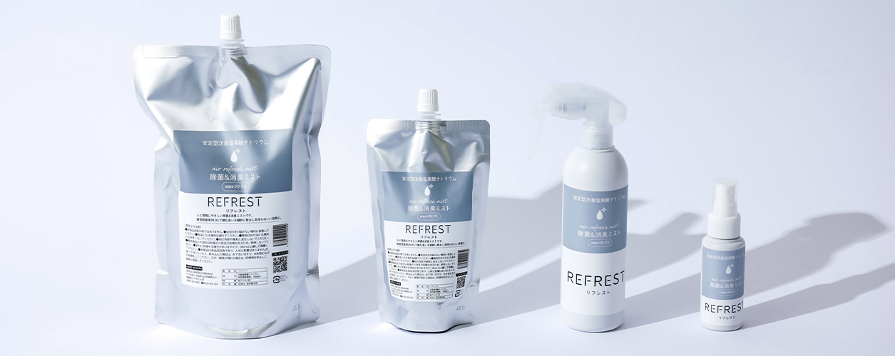 リフレストは次亜塩素酸ナトリウムの単体で混合物が無いことから、成分・効果を「安定型」として提供することが可能です。成分が長期間安定して維持されるため家庭用除菌・消臭ミストに最適。